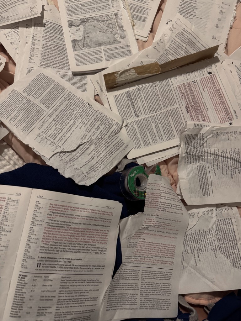My bible isn’t perfect anymore. There are ripped corners, the seam is broken, bent pages, Jonah is holding on by a single thread, and little fragments of Psalm are tucked between Ephesians and Philippians, and weirdly I love that. Because that’s my life right now, out of order, messy, broken, but still held together by grace.